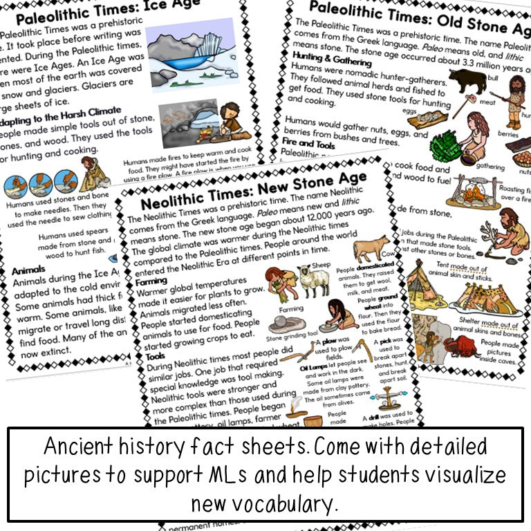 Are your students learning about prehistoric history and need visuals for vocabulary support? Do you work with MLs, including older newcomers that need simple sentences and to review basic vocabulary? Are you teaching historical facts to younger children and need visuals? This set of one page fact sheets, picture vocabulary sheets, and one page mini fold books are a great way to support your students as they learn about the prehistoric ages. Color and black and white pictures are included.