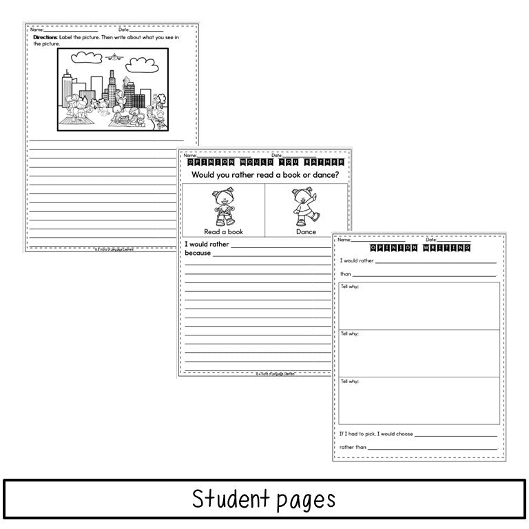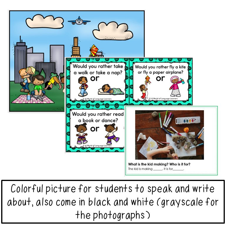 The activities included 4 picture writing prompts, 4 would you rather questions, and 4 picture scenes. If you already own any of these sets, the materials are all new.
