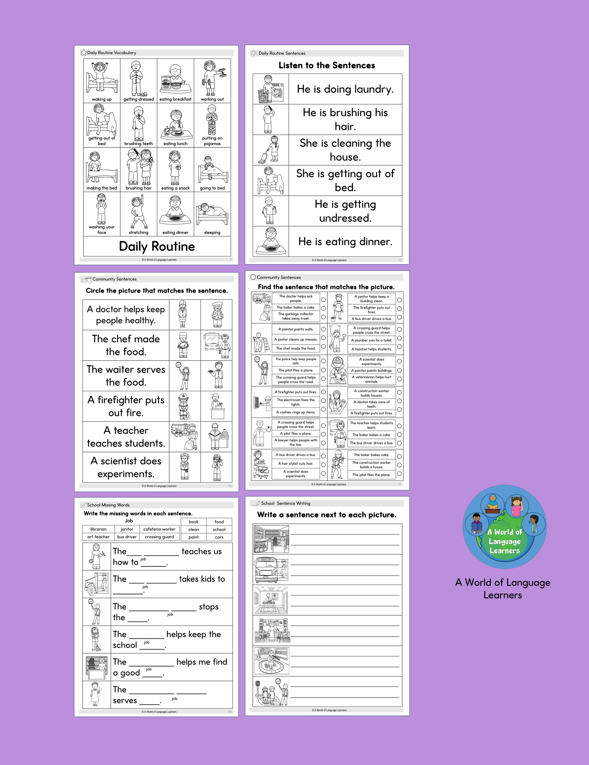 This workbook will help students improve their English vocabulary and gain practice listening to, matching, completing, and writing sentences.
