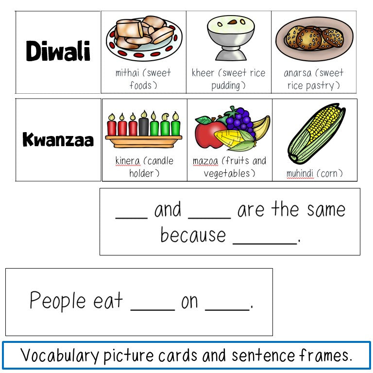 There are picture cards in color and black and white for each holiday. There are also sentence frames to help students talk and write about each holiday or compare and contrast different holidays.
