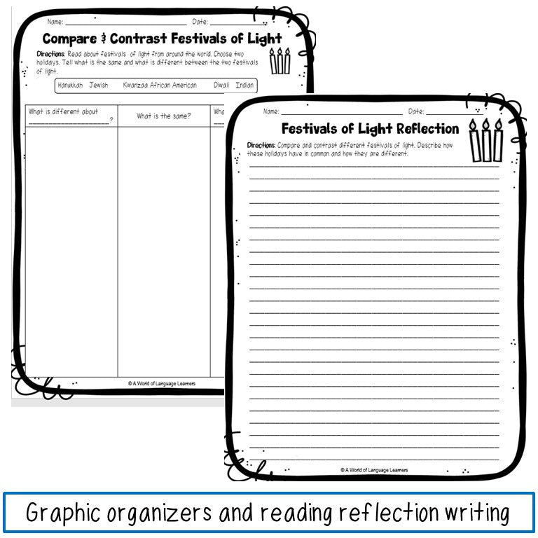 Help students learn about festivals of light from around the world. This includes the Jewish holiday of Hanukkah African American holiday of Kwanzaa and the Hindu holiday of Diwali. Through reading passages and activities students will practice their reading comprehension skills as they learn about different festivals of light.
