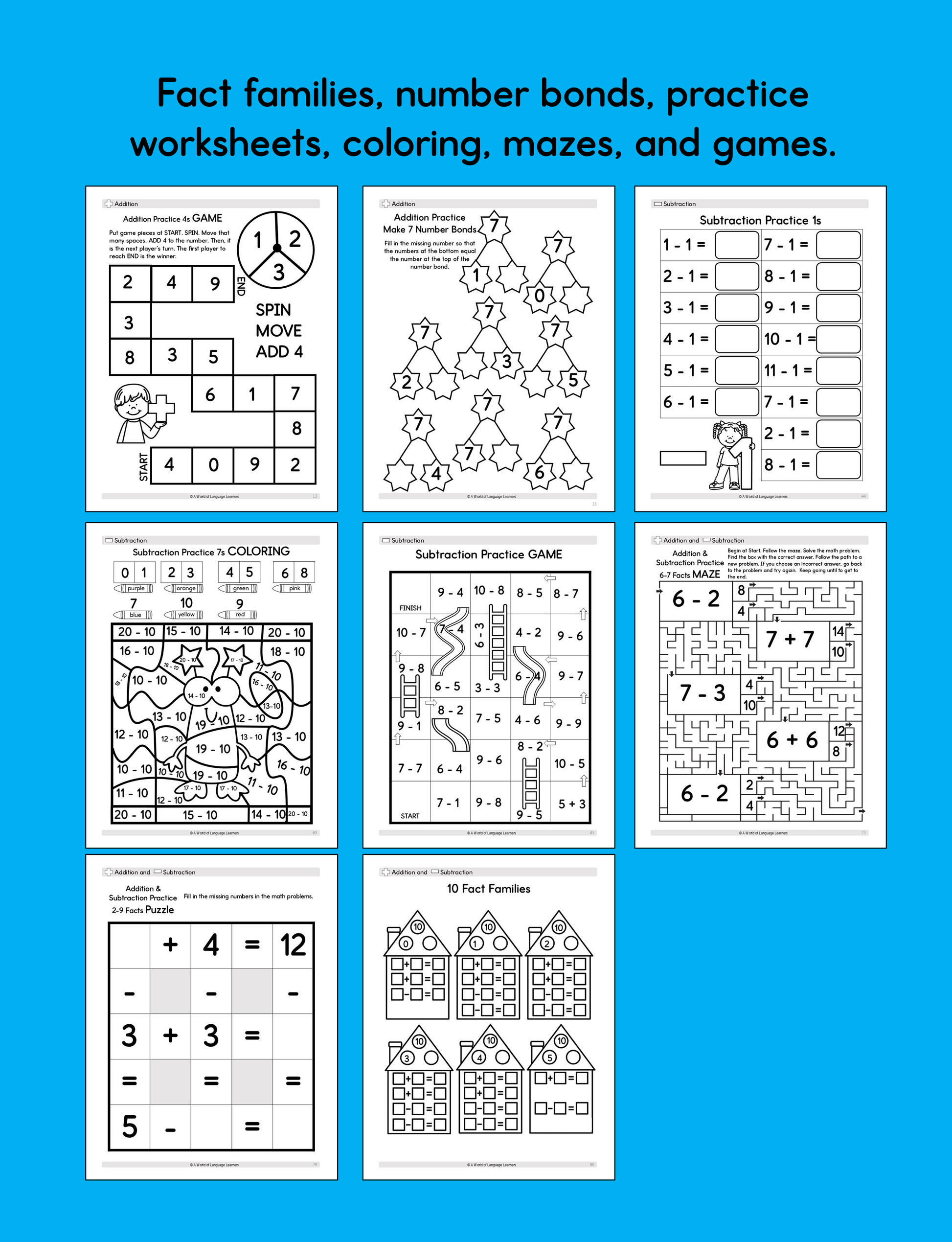 This workbook has a variety of worksheets for students to complete including fact review, color by code, mazes, games, number bonds, and fact families.