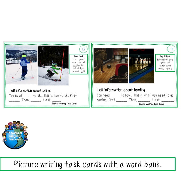 All task cards have a color photograph and a writing prompt. One set also has a word bank and sentence starters. Another set has a word bank. The cards can be used to help English Language Learners or struggling writers.
