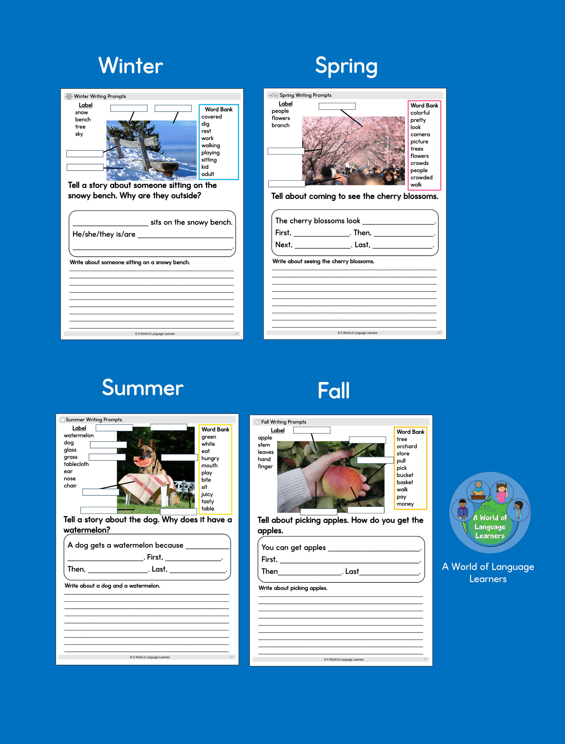 Do your students or kids need help coming up with ideas to write about? Do they need help with vocabulary? This set of seasonal photographs with writing prompts is just what they need. For each season (winter, spring, summer, fall), there are 20 brightly colored photographs and a prompt to help students begin their writing. There are a total of 80 writing prompts included.